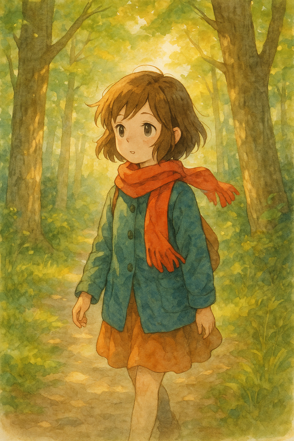 "짧은 갈색 머리와 빨간 스카프를 한 소녀가 조용한 숲길을 천천히 걷고 있다. 키 큰 나무들이 둘러싸고 있고, 잎 사이로 황금빛 햇살이 스며든다. 향수를 불러일으키는 몽환적인 분위기, 부드러운 수채화 질감, 영화 같은 구도, 지브리 스타일 애니메이션 감성"